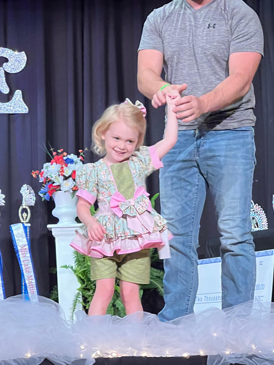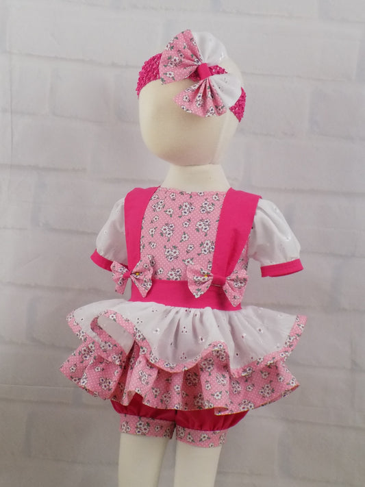 Ditzy Pink Floral and Eyelet Pageant Casual Wear Outfit. Top, Shorts, Suspender Skirt and Bow Set.