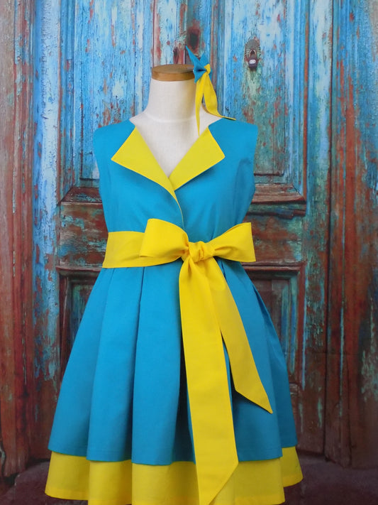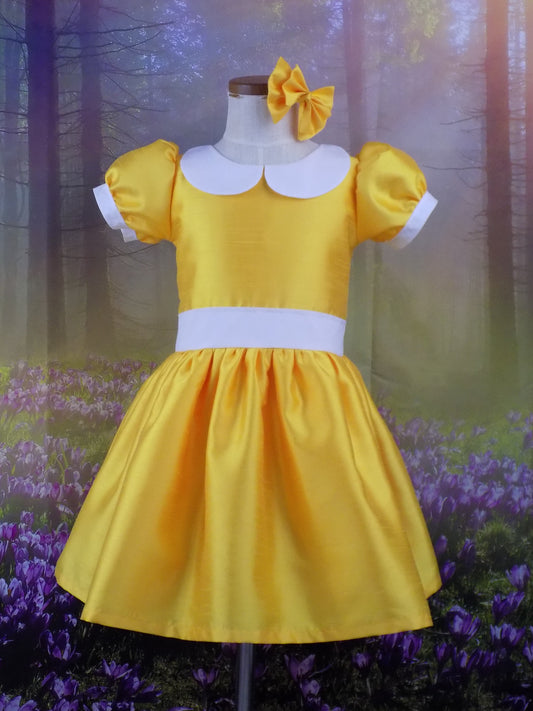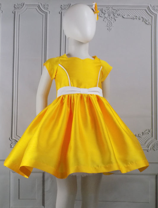 Bright Yellow Interview Dress for Pageants in Faux Silk Dupioni with Hair Bow
