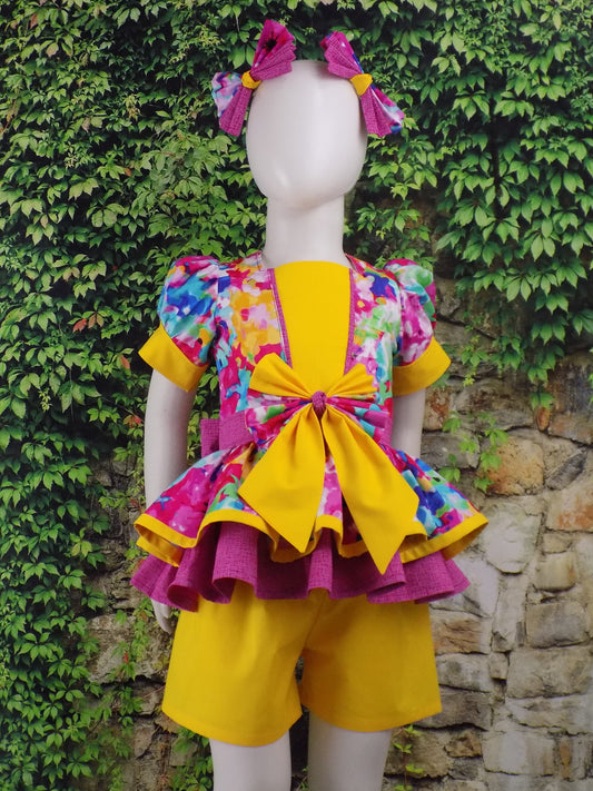 Hot Pink and Yellow Bold and Bright Neon Floral Pageant Casual Wear Outfit. Top Shorts Bow Sportswear Set
