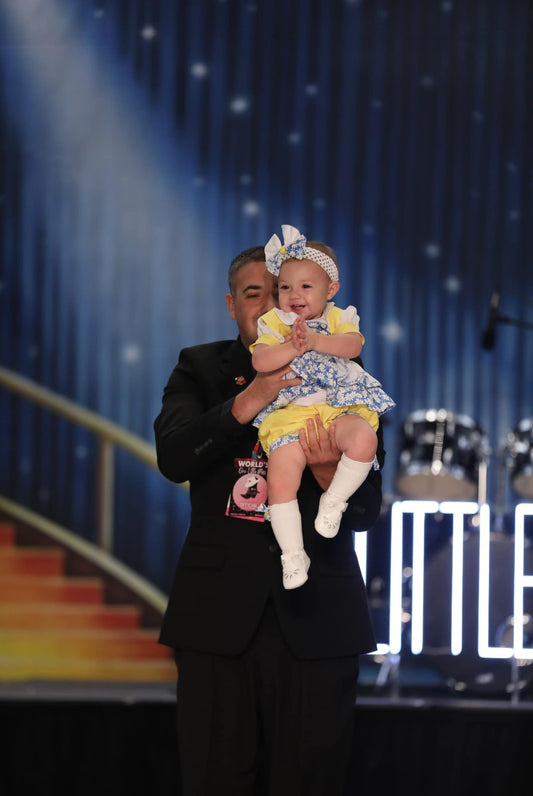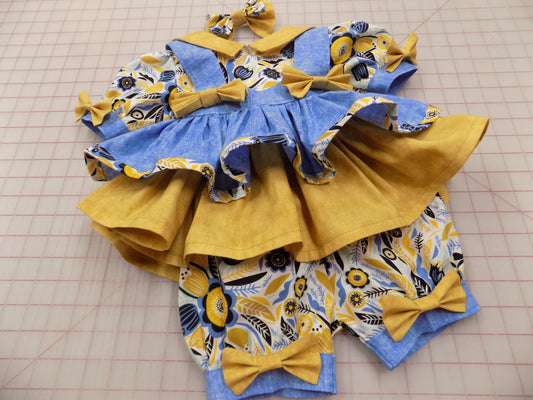 Denim and Mustard Floral Pageant Casual Wear Outfit. Top, Shorts, Suspender Skirt and Bow Set perfect for Fall.