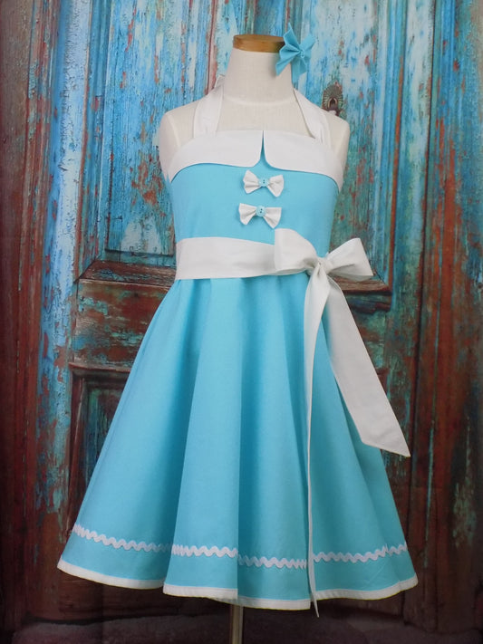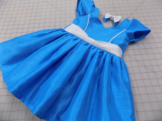 Blue Interview Dress with Sweetheart Neckline for Pageants in Turquoise Faux Silk Dupioni with Hair Bow