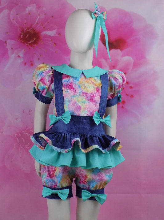 Denim and Tie Dye Pageant Casual Wear Outfit. Top, Shorts, Suspender Skirt and Bows Multi Use Set.