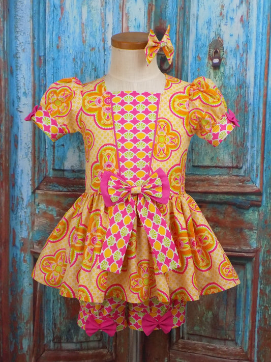 Neon Orange Yellow and Pink Medallion Pageant Casual Wear Outfit. Top Shorts Bow Sportswear Set