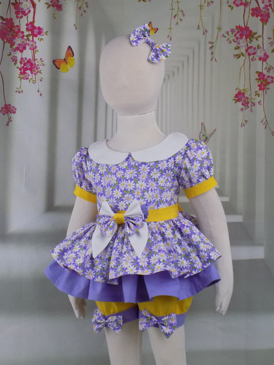 Purple Floral Pageant Casual Wear Outfit with White Daisies. Top Shorts Bows Sportswear Set