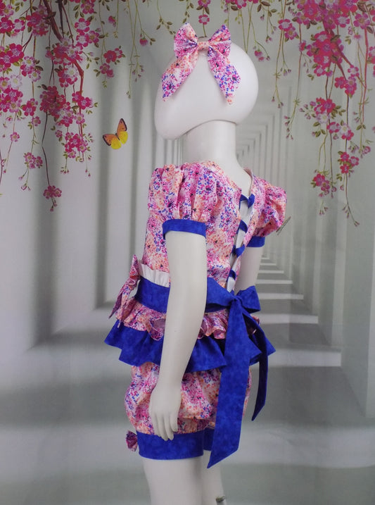 Blue Daisy Floral Pageant Casual Wear Outfit. Top, Shorts, White Eyelet Suspender Skirt and Bow Set.
